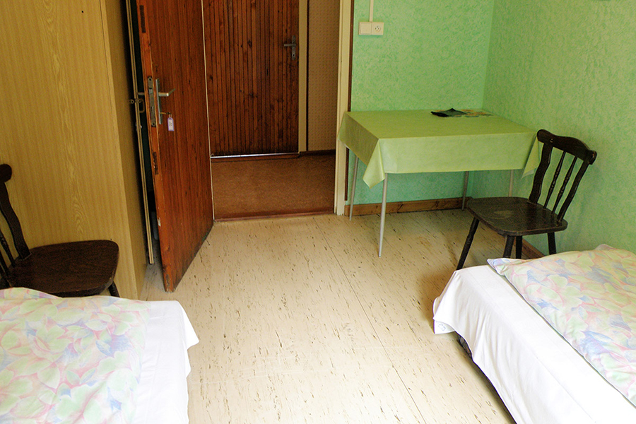 Postele s lůžkovinami a povlečením, skříň, komody, stůl, židle. Na chodbě společná lednice a umyvadlo s teplou vodou, před vchodem do chodby je zastřešená terasa s posezením